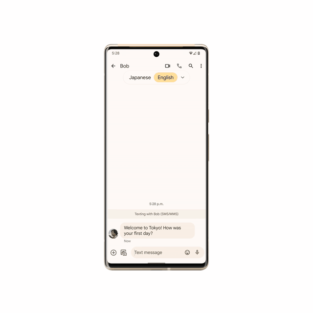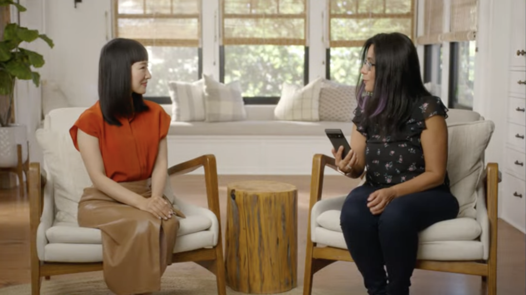 Live Translate 还可以用作线下聊天、采访的翻译工具。在其中一方发言后,Live Translate 会将输入翻译为另一种语言播放。在发布会上,Google 还请来了以收纳法闻名的近藤麻理惠,与 Google 的产品经理通过 Live Translate 功能进行了一次简短的沟通。