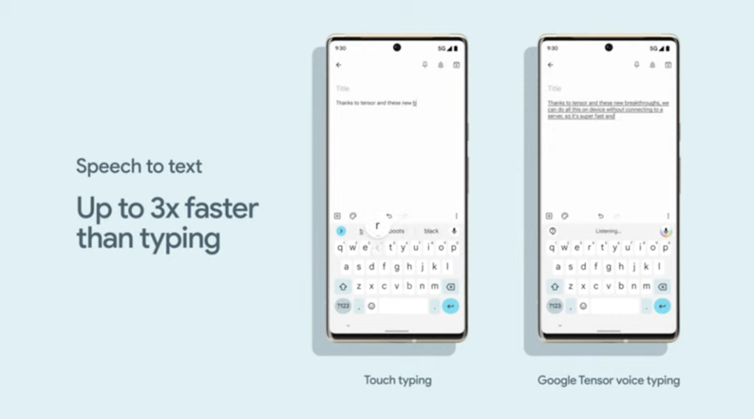 Google Pixel 6 系列在进行语音输入的过程中可以更好地区分语音和背景噪声、输入内容与编辑指令甚至不同的口音与方言——从演示效果来看,除了更快、更准确的语音转文本体验外,Pixel 6 系列所搭载的语音转文本算法还能智能识别文本编辑指令,比如将「清除」「撤销」等指令同其它输入内容区分,同时还能记住用户的特殊输入偏好,如人名、地名等,减少不必要的编辑操作。