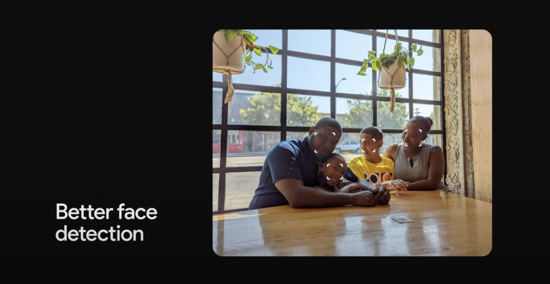 在光线条件较差、被摄主体动作变化较大的拍摄场景中,成片模糊是常有的事。Google Pixel 6 系列同样也会借助 Tensor 的本地机器学习算法来解决这一受物理条件限制的难题:在用户按下快门前,相机应用就会借助 FaceSSD 算法判断拍摄场景中是否有人物面部出现,如果拍摄主体为人物且获取到的面部图像较为模糊,相机就会开始在主摄之外同时调用超广角镜头进行图像合成;其中主摄获取到的图像信息用于曝光和降噪、超广角则会通过更快的快门时间来减少模糊、提高面部清晰度。