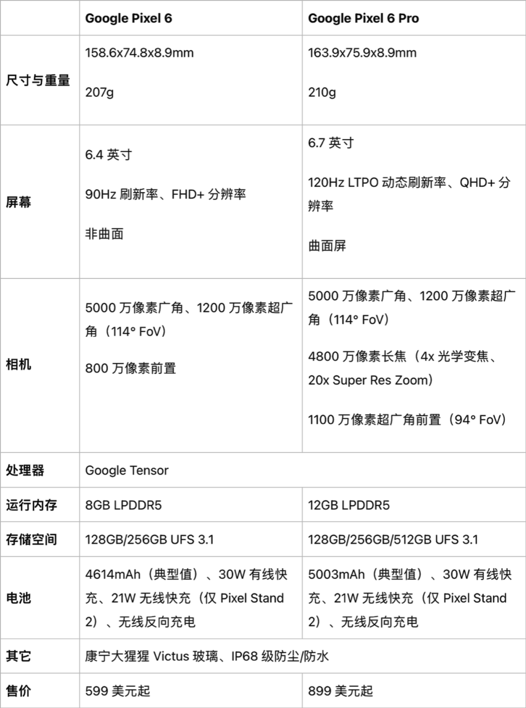 除了外观和配色上有差异,Google Pixel 6 和 Pixel 6 Pro 在很多细节上也拉开了差距。