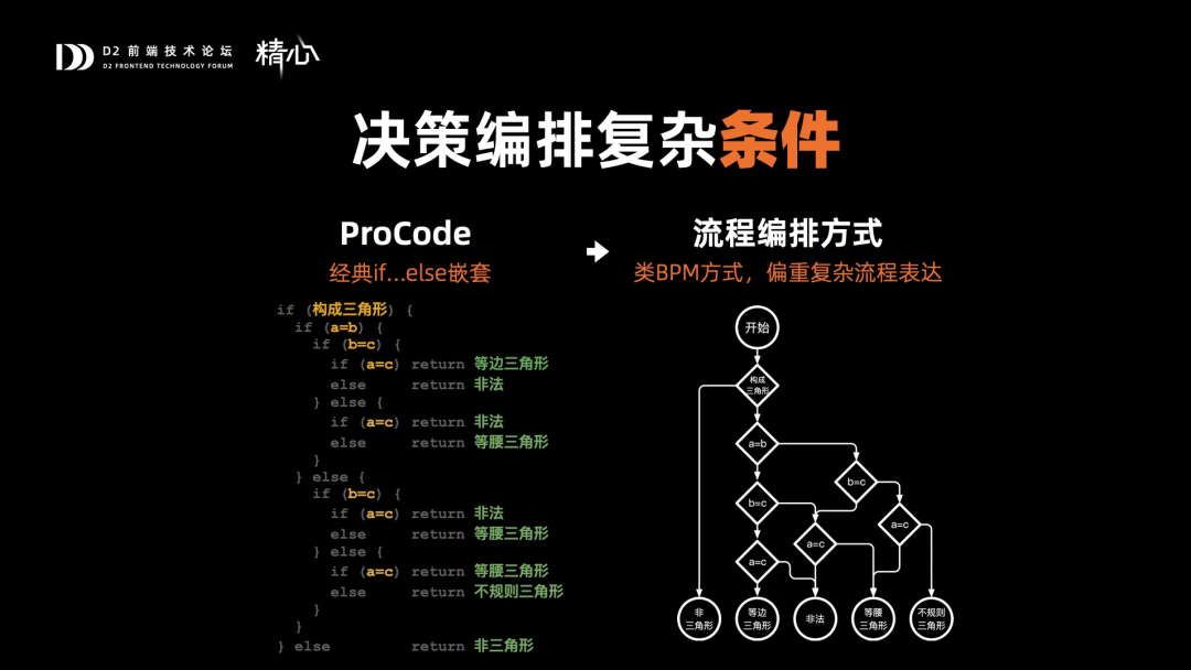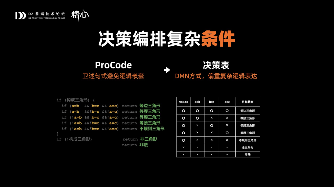 如果换一种写法,将ProCode转为卫述句式,虽然有了一些冗余,但是整体code结构变得很清楚,那这种方式,可以使用决策表来表达,也就是偏重复杂逻辑表达的方式。