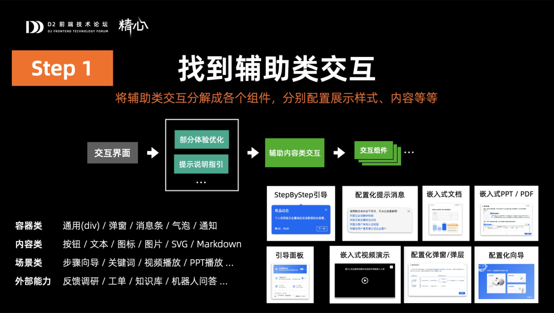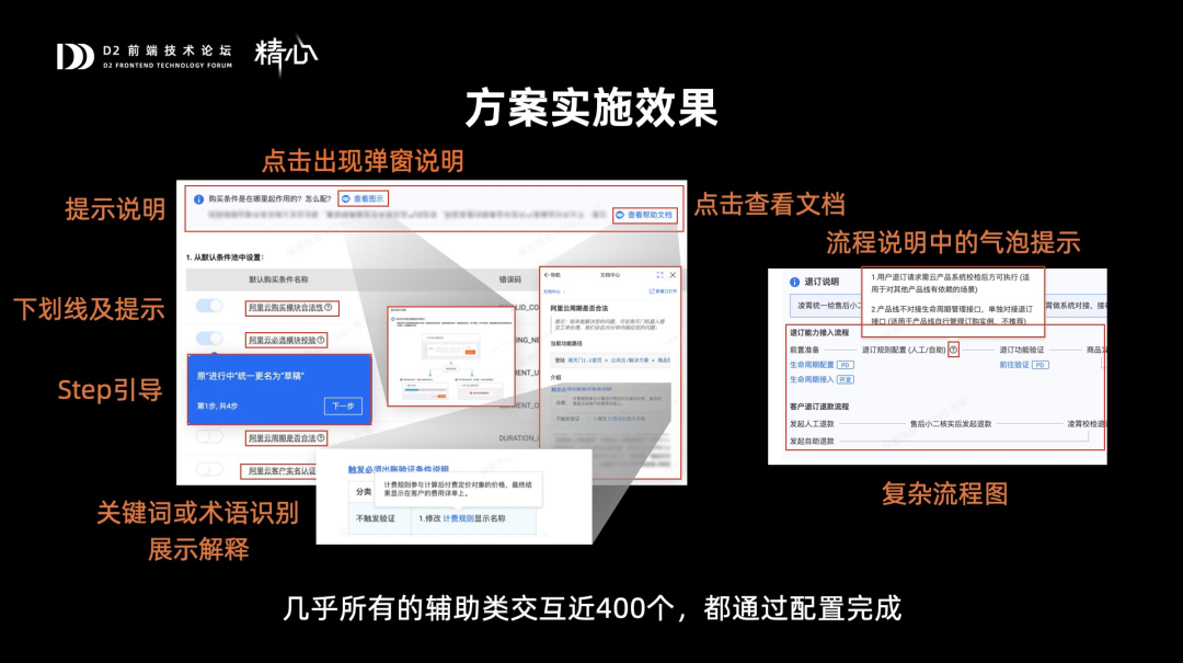 这是一个比较复杂的配置页,使用了大量引导类交互,有点击出现弹窗、查看文档、还有各种加下划线气泡、stepbystep引导、还有更过分的要加复杂流程图、这是SVG做的,图里面还要带有气泡按钮解释的,等等,像这种交互在系统中有近400个,如果把这些写在代码里面,是一个非常大的负担,而这些,我们都是通过低代码配置化去解决的。