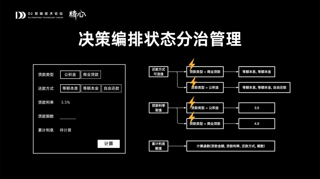 我们将贷款类型、还款方式、贷款利率、贷款期数和累计利息作为不同的对象,将这些对象的状态,如赋值、可选值等,组织成为三颗决策树。当贷款类型的值变更时、还款方式的可选值以及贷款利率的取值都会发生变化,点击计算时,手动调用第三颗决策树计算出结果。