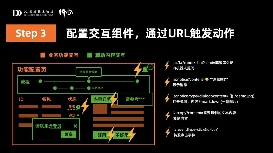 第三步,这些组件可能互相之间是有交互的,比如点击问号按钮的时候出现弹窗,点击好用不好用的时候要感谢反馈等等,这个我们是通过一种自定义协议的url来完成的,这里给出了一些例子来展示下我们正在使用的动作,如: