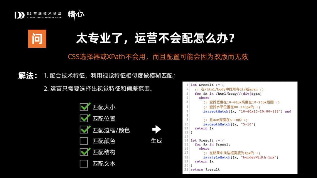 这类问题我们的实践方案是,可以通过视觉特征的相似度去做模糊匹配,使用者只要去勾选出相应的特征和偏差范围,就可以自动生成脚本去做匹配,这里我们是通过扩展了XQuery形成了自己的模糊查询方式。