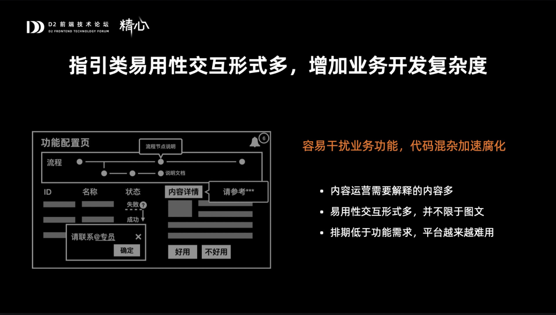 试想,在中后台系统中,没有说明、没有指引,那该有多难用?所以通过内容运营,增加指引提升易用性是十分必要的,但对于前端开发来说,又像是下了一道魔咒。为什么这么说呢?