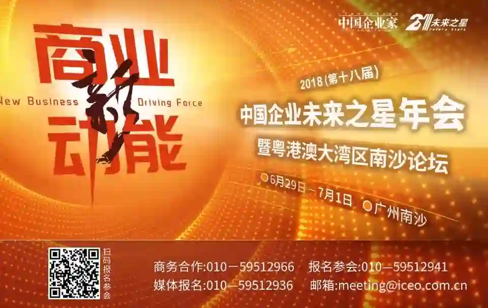 2018(第十八届)中国企业未来之星年会暨粤港澳大湾区南沙论坛将于6月29日至7月1日在广州南沙举行,人工智能、新零售、大健康、金融科技等领域最热门的独角兽公司、数十位顶级投资人、最创新企业领导人齐聚南沙,探讨“商业新动能”,欢迎点击下图报名参会。
