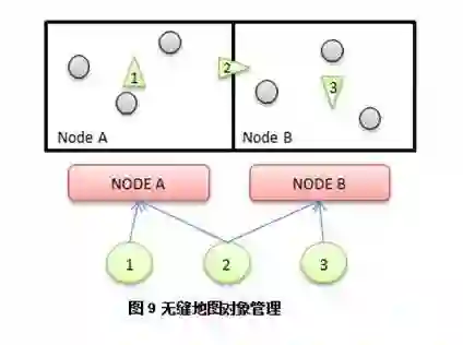 还是将地图按照标准尺寸均匀切割成静态的网格,每个格子由一个具体的Node负责,但是根据负载情况,能够实时的迁移到其他 Node上。在迁移分为三个阶段:准备,切换,完成。三个状态由Node Master负责维护。准备阶段新的 Node开始同步老 Node上面该网格的数据,完成后告诉NM;NM确认OK后同时通知新旧 Node完成切换。完成切换后,如果 Obj服务器还在和老的 Node进行通信,老的 Node将会对它进行纠正,得到纠正的 OBJ将修正自己的状态,和新的 Node进行通信。