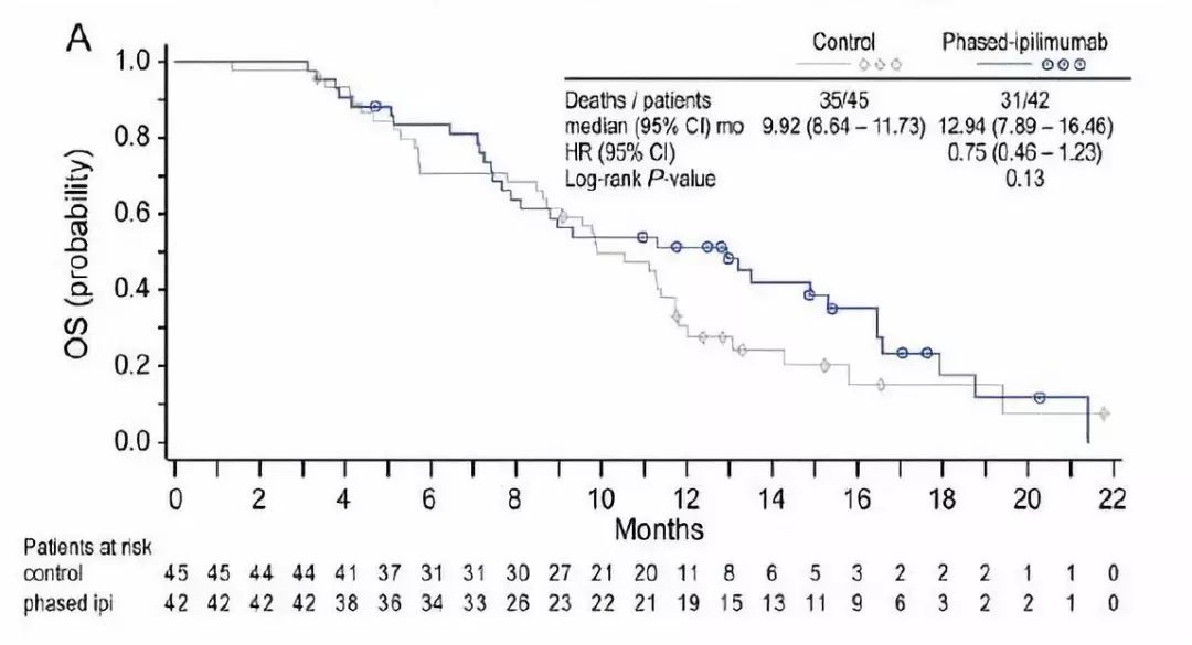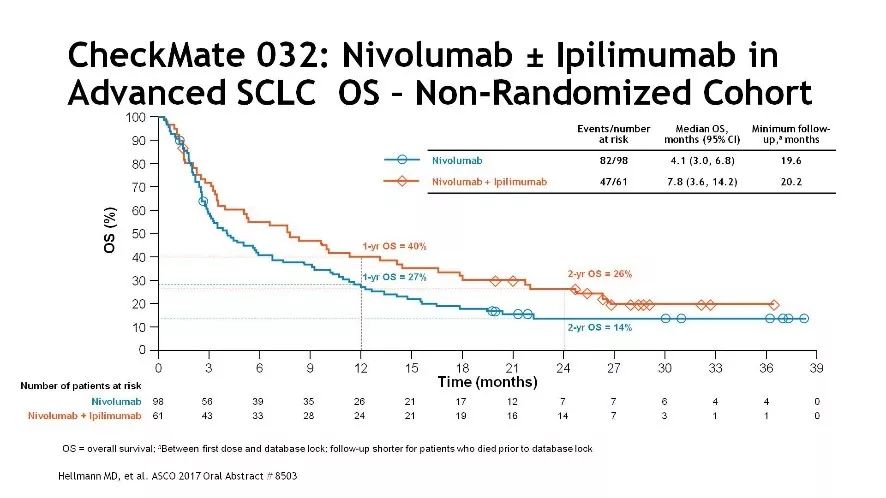 随后2016年Reck等的另一项对比ipi联合EP方案 vs 单纯化疗的临床研究也得到了类似的结果。两组的无进展生存期(PFS)和OS分别为4.6月 vs 4.4月和11.0 月 vs 10.9月,两组无统计学差异。这两个结果的公布无疑给了免疫治疗踏入SCLC领域一个“下马威”。