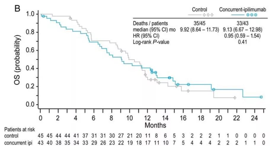 首先在ES-SCLC领域尝试的免疫治疗药物为ipilimumab(ipi)。作为首个免疫检查点抑制剂应用于SCLC患者的Ⅱ期临床研究,Reck等发表在《肿瘤学年鉴》(Annals of oncology)上的结果令人失望。该研究按1:1:1的比例分为紫杉醇+卡铂(PC)同步ipi,PC序贯ipi和单纯化疗3臂。结果表明,无论同步还是序贯ipilimumab治疗,即便是对比单纯PC方案,也没有观测到OS的获益,图1。