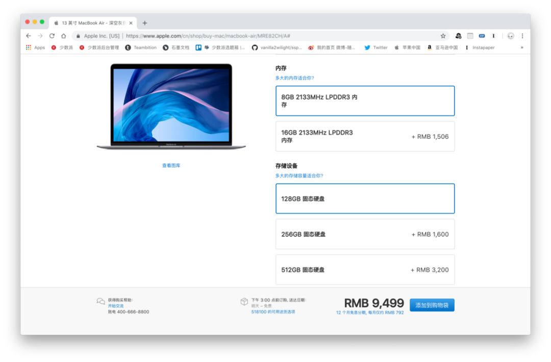 2018 高配款 MacBook Air(8GB 内存 & 256GB 固态硬盘):11,099 元