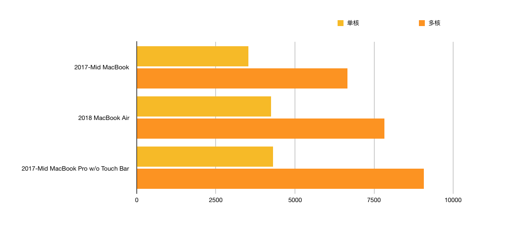 另外,我还分别查询了 Geekbench 上 2017 Mid 基础款的 MacBook、2017 Mid 款不带 Touch Bar 的 MacBook Pro 和新款 MacBook Air 的单核 / 多核跑分,从下图的结果中可以看出新款 MacBook Air 的 CPU 性能并没有比 2017 Mid 款不带 Touch Bar 的 MacBook Pro 差很多。