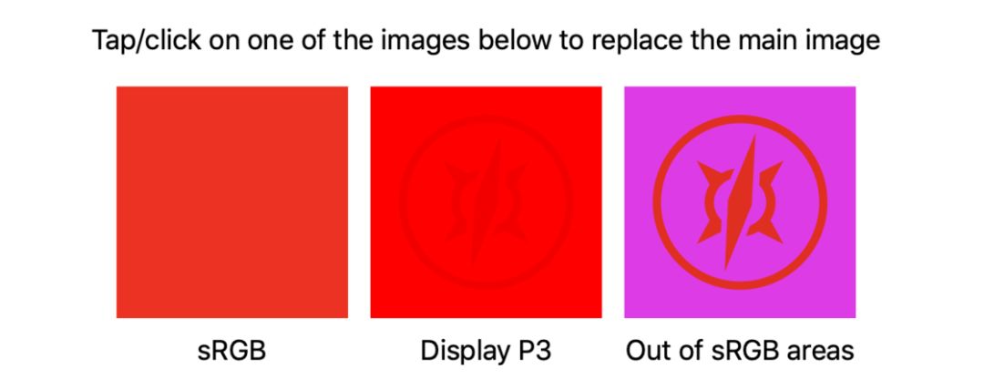 除此之外,苹果官方宣称新款 MacBook Air 的屏幕是全标准色域 (sRGB),比上一代提升了 48%。而 2018 新款 MacBook Pro 的屏幕是广色域 (P3),并且配备了原彩显示技术 (True Tone)。下面是一张从 MacBook Pro 截取的测试图片,在新款 MacBook Air 上是看不到第二个红色方块上的图案的,但是如果你正在使用配备了 P3 广色域的设备观看本篇文章,那么你能在第二个红色方块上看到一个指南针一样的图案(类似于图三)。