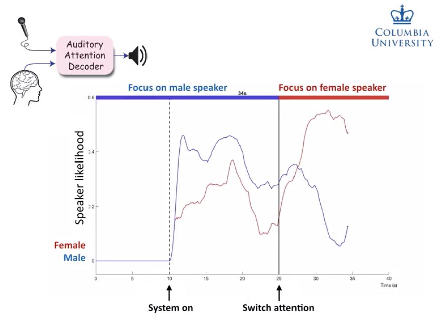 首先从一个组中分离出每个说话者的声音。设备自动将多个扬声器分离成单独的流,然后将每个扬声器与来自用户大脑的神经数据进行比对。一旦某人的声音模式与听者的脑电波匹配度最高,他的声音就会被放大。