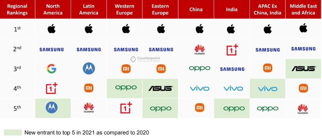 中国市场最受欢迎的高端品牌有苹果、华为、OPPO、vivo、小米(份额从高到低);美国市场有苹果、三星、谷歌、一加、摩托罗拉;西欧有苹果、三星、小米、OPPO、一加。