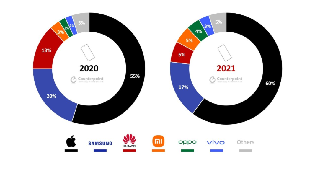 市调机构 Counterpoint 近日公布了 2021 年全球高端手机市场报告,报告中统计机型的平均售价超 400 美元。报告显示,2021 年全球高端智能手机的销售额创历史新高,较去年同期增长 24%,远超手机市场 7% 的增速。另外,高端智能手机占据了全球智能手机销量 27% 的份额。