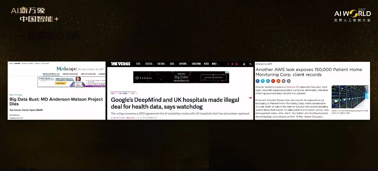 这里数据维度和异质性就不讲了。还有数据偏倚,比如沃森只能在美国病人群体上用,在菲律宾怎么用?还有模型的可解释性,我们用深层学习模型去预测皮肤癌,但结果皮肤科医生不敢用,因为医生需要知道是由于出现哪些特点,才导致了这样一个预测结果,模型的解释性要强。还有模型的适用性,前面说了,AlphaGO Zero的优势在于不需要数据,它的规则非常清晰,但医疗领域没有那么清晰的规则。还有隐私性,有学者在专门研究怎样在不泄漏任何隐私的条件下做医疗分析。
