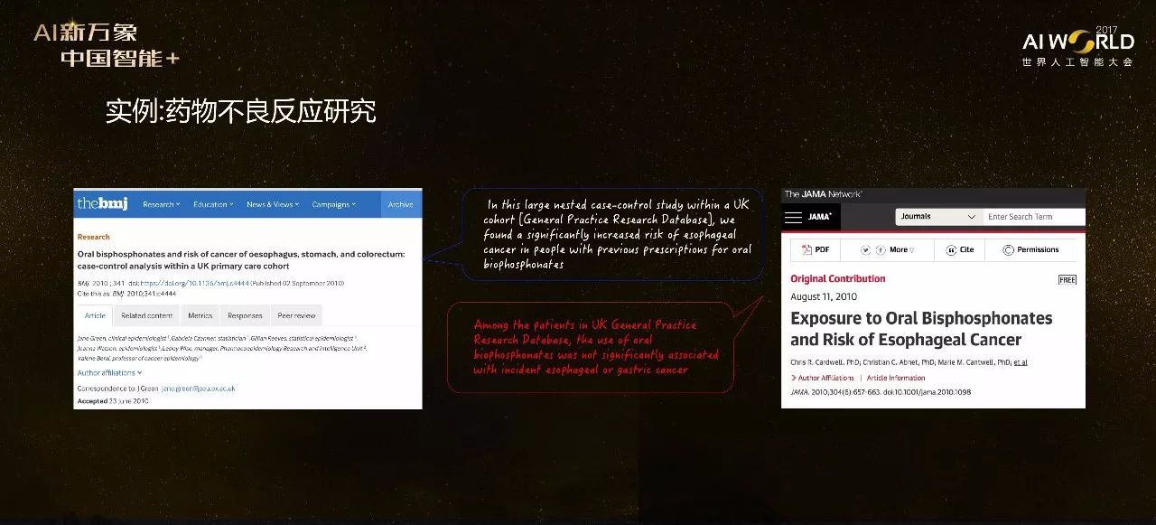 另一个例子是药物不良反应研究。BMJ上2010年9月份曾发表过一篇论文,发现吃双磷酸盐这种药,会极大提升食管癌发病率。而同年8月,JAMA在同样的问题上做了研究,发现吃这种药和食管癌发病率提升没有明显关系。课件这两篇在同一时期发表在两本不同顶级临床医学杂志上的文章的除了截然不同的结论,并且他们还都是在同一个病人队列中进行的研究。这个情况在医药学中经常出现,我们经常强调数据质量,其实这远不止数据质量的问题,我们需要考虑很多因素来保证从数据中发现的不是噪音,而是真实的结果。