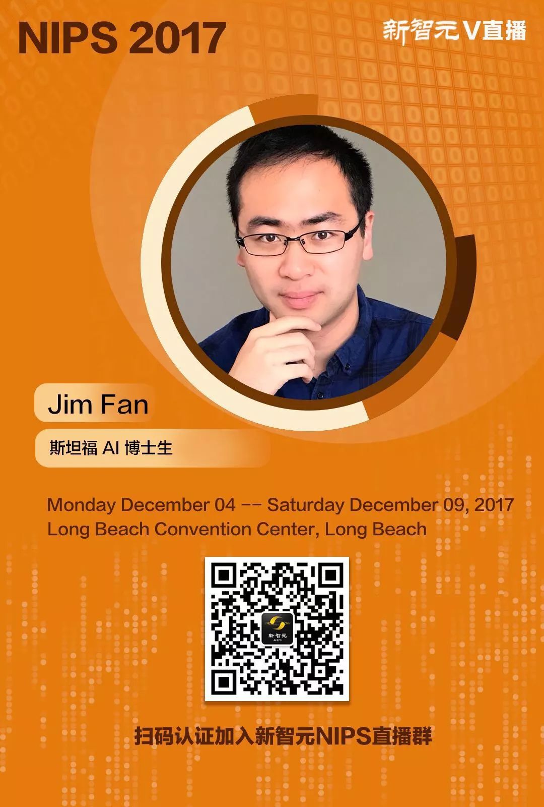 NIPS 2017,新智元智库专家、CMU计算机学院副教授马坚老师和斯坦福大学AI博士生Jim Fan将在美国长滩带来现场直播,关注新智元小程序或扫描下方二维码加入直播群,参与直播互动,第一时间了解NIPS前沿资讯。