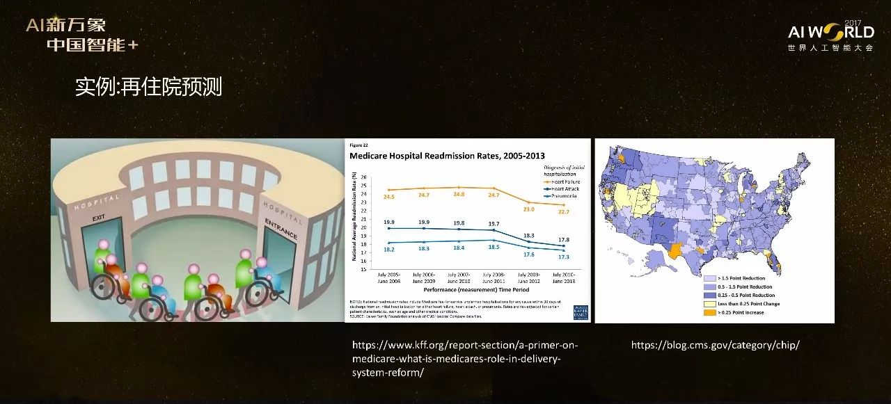 第一个例子,我们说说再住院预测(Hospital Readmission Prediction),这是很火的一个话题,2012、2013年有机构曾专门投入300万美元来做这项研究。再住院是指你住了院以后,出院很短时间内又住回来,这种情况很有可能是因为医院措施不当。一般来讲再定义的时间一般是30天 。像CMS会惩罚重复住院率很高的医院。这是一些重复住院率非常高的疾病,比如说像心衰,心脏病,还有肺炎。这是一个美国地图,我们可以看到超时曲线的下降,就是因为CMS出台的高再住院率处罚政策,证明这个政策还是有效的。