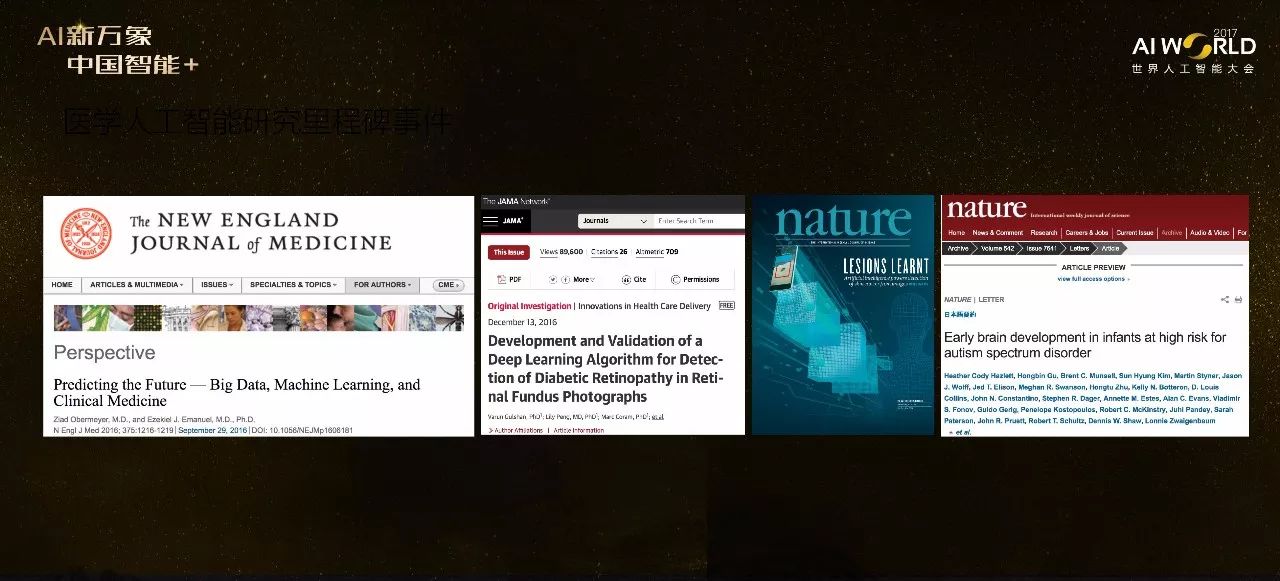 今年发生的多个重要事件让AI在医学领域的应用变得非常火爆。首先是我的一个医生朋友去年在新英格兰医学杂志上发表的一篇论文,讨论了大数据和机器学习对临床医学的一些影响,里面有一个观点:以前大家用的AI是专家系统,专家系统就好比是医学院的学生,毕业后做医生看病时实际是把病人当前状况和书本里面学到的知识作比较,书本里叫我怎样做我就应该怎样做。而现在的机器学习和AI更像是已经在看病人的医生,从已有的案列中寻找相似性,绝非仅限于书本知识 。