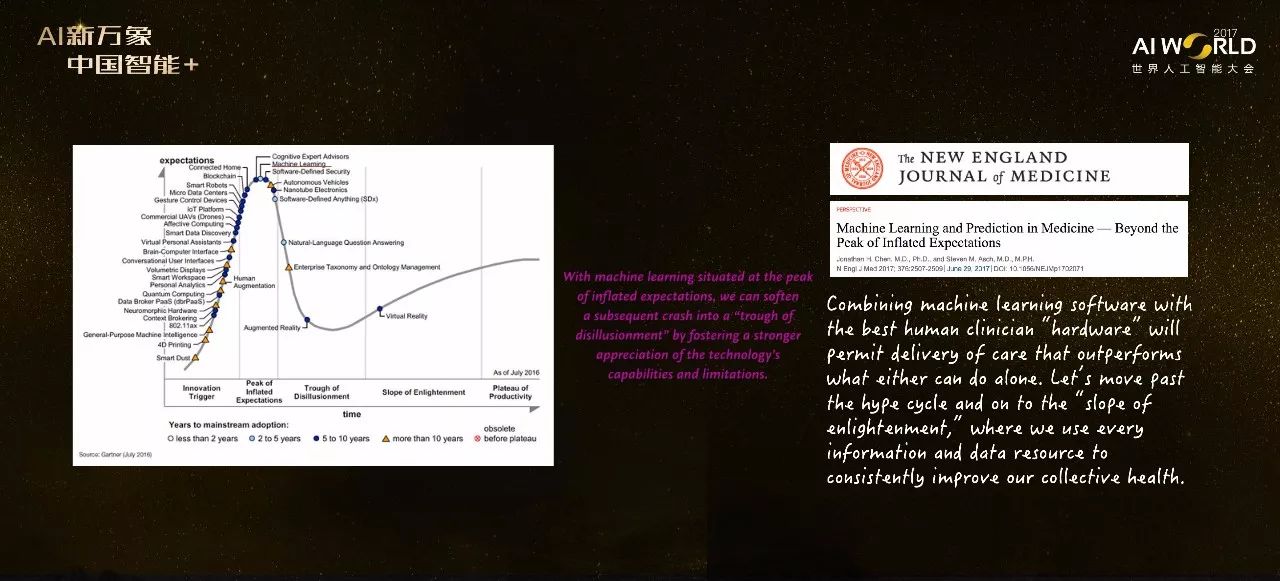 从2016年的曲线图上我们能看到,机器学习是在peak inflated expectation上的,那么接下来它就会下行。今年早些时候新英格兰医学杂志上的一篇评论指出,为了让机器学习的方法在医学中的应用平稳的度过这个下行期,一个重要的途径是正确认识机器学习方法的局限性,与医生的知识相结合。