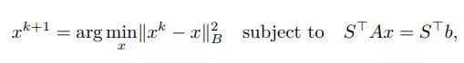 直观地看,由于我们认为原系统 Ax = b 很复杂,我们可以用一个更简单的系统替换它——一个随机的原始系统的草图,其解集 {x | S^T Ax = S^T b} 包了含所有的原始系统的解。x^(k + 1) 可以被认为是最接近 x^k 的点,它可以作为原始版本的线性系统的解。草图系统通常会有很多的解,为了找到最好的 x^(k + 1),我们需要一种方法从解集中来选择它。这个想法需要试图保留尽可能多的目前学到的信息,这些信息是在当前的点 x^k 上提炼而来的。