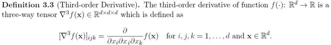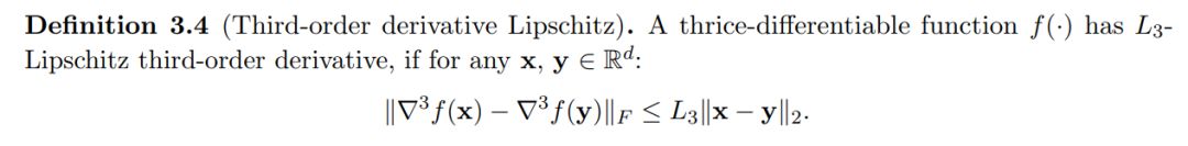 Anandkumar 和 Ge(2016)引入了上述定义,Carmon et al.(2017)也将三阶导数 Lipschitz 称为三阶平滑度。三阶导数 Lipschitz 和三阶平滑这两个术语在下面的章节中可以互换使用。