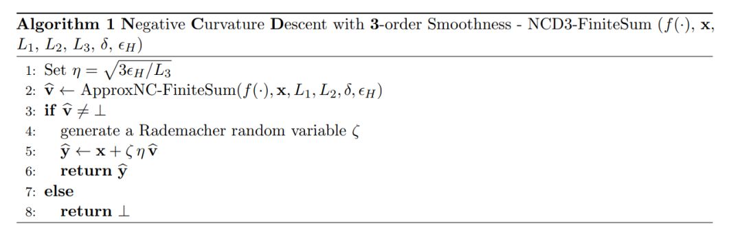 在这里,ApproxNC-FiniteSum(·) 函数是利用随机梯度或随机 Hessian 向量积求负曲率方向的函数。该函数会返回一个向量 v^,它是从当前点 x 开始的一个负的下降方向。请注意,我们还可以通过其它方法找到这个向量,即使用 Mokhtari、Ozdaglar 和 Jadbabaie 提出的方法。