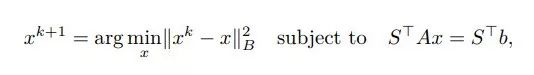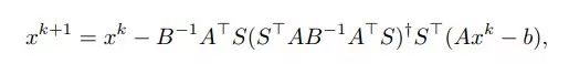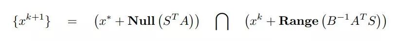 因此,我们可以看到,在下一轮迭代中,x^(k+1) 将成为两个随机仿射空间(x^{k} + Range(A^T S) 和 x* + Null(S^T A))的交点:我们可以等价地将 x^(k+1) 看成 x^k 在 x* + Null(S^TA) 上的投影。