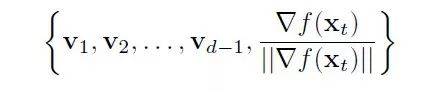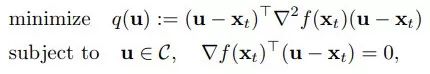 这一步所得的结果(28)是一个众所周知的问题,可以使用标准的优化技术来解决。从(26)到(28)的转换背后的思路是:由于切线方向▽ f(x_t)∈R^d,我们可以让它作为 R^d 的一个基向量。剩下的 A 的列构成的基向量形成了向量空间 R^(d-1),他们都正交于切线方向。通过在 A 的列空间中搜索向量,即,z = Ay,这样可以保证得到满足约束▽ f(x_t)(u - x_t) = 0 的解。