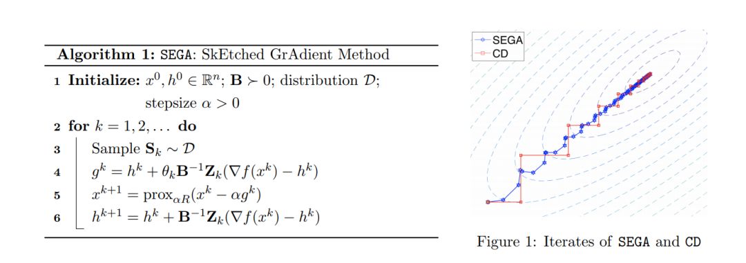 现在,读者已经熟悉了草图与投影的概念和使用方法,我们将继续探讨这篇论文的内容。作者提出了一种随机一阶优化方法——SkEtched GrAdient (SEGA),该方法通过迭代逐步建立梯度的方差缩减估计值,该估计值来自于从理想状态获得的梯度的随机线性测量(草图)。