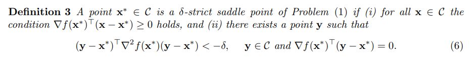 在第一步中,算法使用一阶更新来查找 ε 一阶驻点(FOSP)。ε 一阶驻点是一个满足条件(4)的点 x*,在第二步中,如果它是一个鞍点,算法利用 f 的二阶信息跳出该驻点。