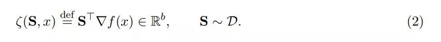 其中 f 为 R^n →R 的映射,它是平滑的凸函数,而 R(x) 是封闭的凸正则化项。作者没有假设我们可以得到真正的梯度▽f(x)。然而,假设理想状态 oracle 提供梯度的随机草图(它只是一种线性变换),我们可以用它来驱动迭代过程。具体而言,在矩阵 S∈R^(n*b)(b≥1,可以将其固定,但并不一定需要这么做)上给定一个固定的分布 D,和一个查询点 x ∈R^n,oracle 提供了算法的随机线性变换的梯度