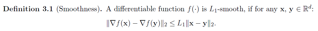 正如上面所示的定义,Lipschitz 常数 L1 和 L2 分别取决于▽ f(x) 和 ▽ ^2 f(x)。因此,这些常数可能对于一个函数来说很小而对于另一个函数很大。从定义 3.1 可以看出,如果 L1 很小,那么 f(x) 在 x 的变化很小时可能也只有很小的变化,而如果 L1 很大,那么 f(x) 在 x 变换很小时也可能有很大的变化。