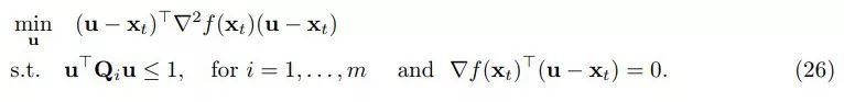 任意满足▽ f(x_t)=0 的向量 z 可以被写作 z=Ay,其中 y=(u-x_t)∈R^(d-1)。因此,(26)中的优化问题可以被写作如下形式: