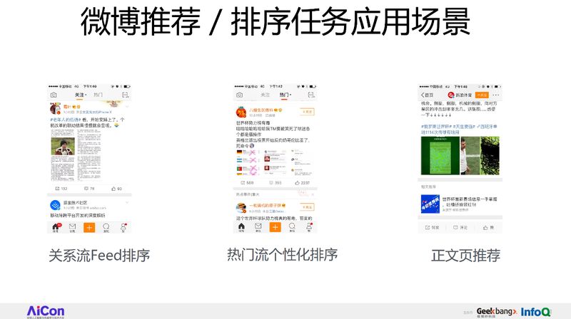 因为我来自于微博,所以我简单地介绍一下,在微博有哪些场景是应用推荐、CTR 以及排序任务的。