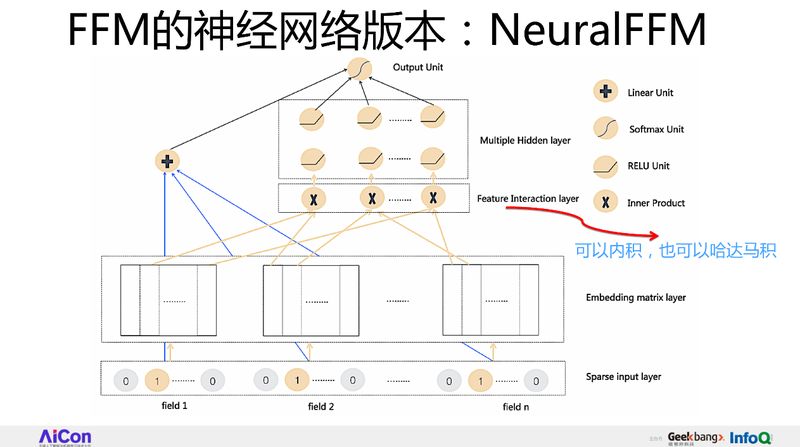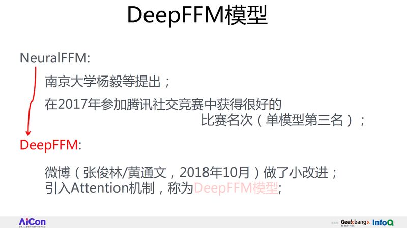 我先给出一个前导模型:NeuralFFM,这是 2017 年南京大学杨毅等人提的,他们在参加一个比赛中提出了这个模型,这个模型效果比较好,是单模型的第三名。我们对这个模型做了一个改进,把它叫做 DeepFFM。