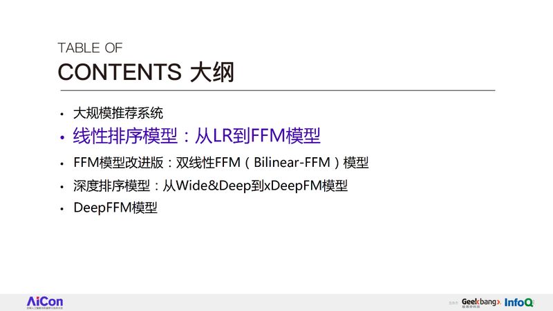今天我们主要介绍一下,FFM 和它的深度学习模型版本。今天我要跟大家分享的一个大的提纲。