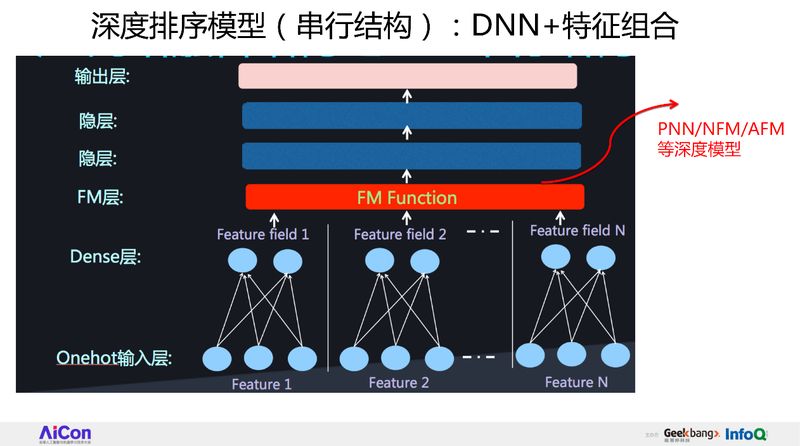 所有的深度学习,做 CTR 的模型时都会有 DNN 的部分,没有例外。什么含义呢?特征输进去,然后把它转换成 embedding,上面套两个隐层进行预测,这是所有模型公有的一部分。