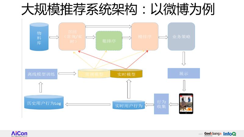 所谓实时的意思就是:用户刷了一条微博,或者互动了一条微博,立刻就在刷出下一条微博的时候,体现出用户刚才这个行为了。当然还可以往后发展,比如我们会计算一个离线模型,因为这个模型它的训练数据更充分、更精准。通过这种方式,我们会定期地更新线上的这三个模型,这就是典型的工业界做大规模推荐系统的整体流程。