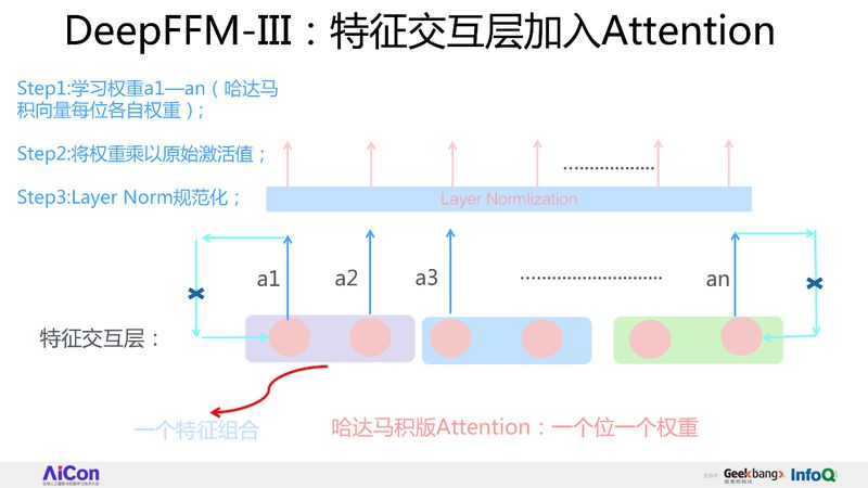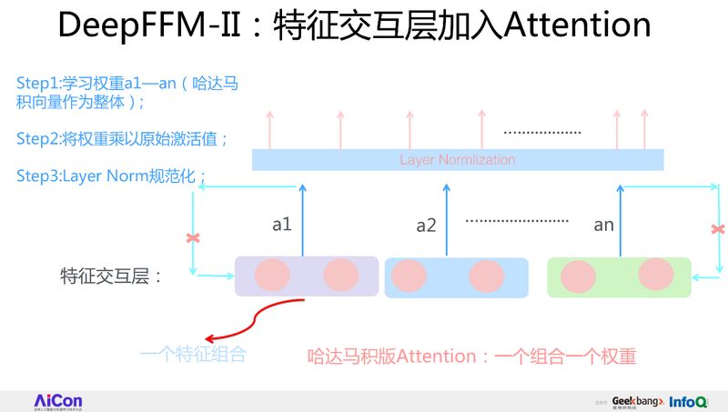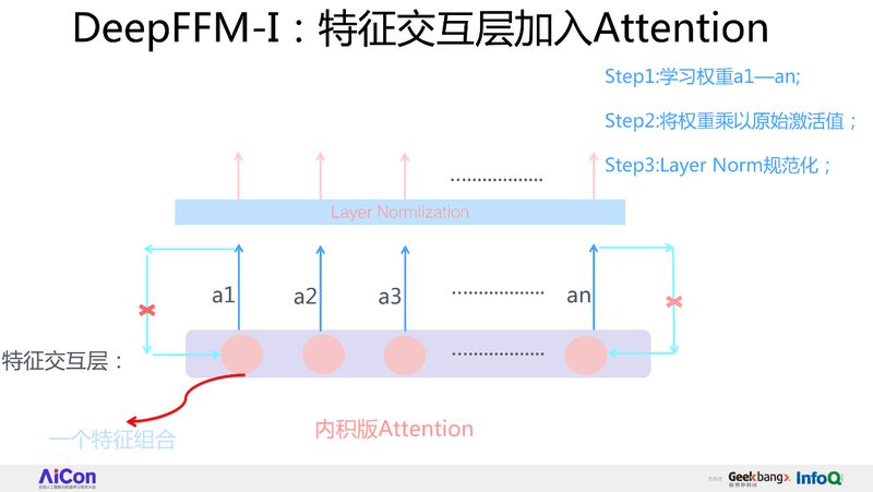 再回头讲,我们是怎么改进的。在特征交互层,我们先给出个内积版,这是一个特征组合,组合完是一个值,我给每个两两特征组合的值都加个权重 a1-an,加完权重之后,再把权重乘到值里,再加上 Layer Norm,往上面引层去走,这是第一个改进版本。