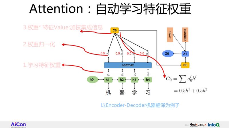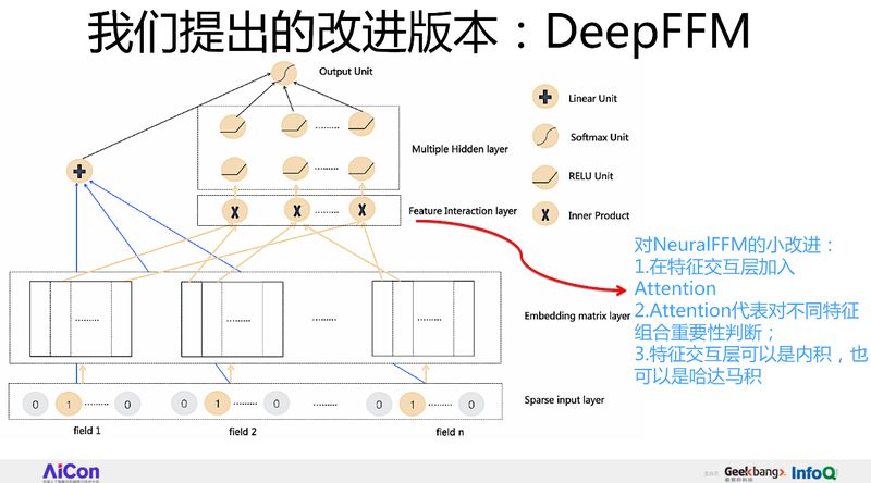 我们这个 DeepFFM 是怎么改进的呢?在特征交互层,也就是两两特征在这组合,我们加了一个 Attention,也就是一个注意力模型进去。我认识两两特征组合,但是有的组合特征比较重要,有的没那么重要,怎么体现这个思想?给每个特征组加个权重就可以。怎么给权重?加个 Attention 就可以了。这就是我们 DeepFFM 的核心思想。