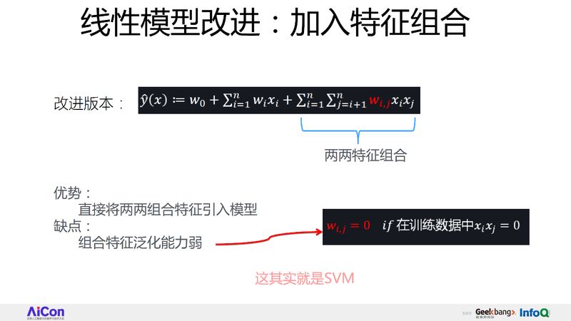 我们把特征组合显式的,简单的揉进了这个公式,所以它的好处是:现在能够捕获两两特征组合。那么它也有问题吗?刚才我们改进的模型本质是 SVM,所以应该再改一改,它的问题是特征组合的泛化能力弱,于是我们进一步进行了修改。