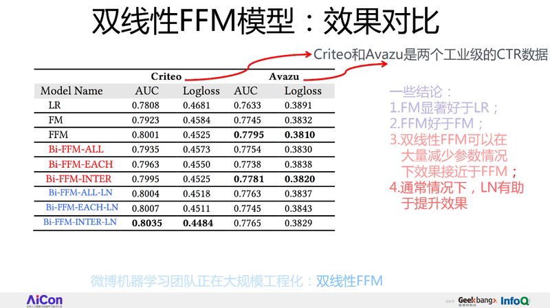 先说 LR 和 FM,可以从数据里面看出来,FM 是显著优于 LR 的,这两个数据都是这样。首先要确认一点,不要期望太高。提了五个点、十个点,在 CTR 里是见不到这种现象的,在 CTR 能升一个点就是非常显著的一个增加。FM 跟 FFM 比,AUC 从 0.7923 到 0.8001,也是显著提升的,这是这三个模型的特性。