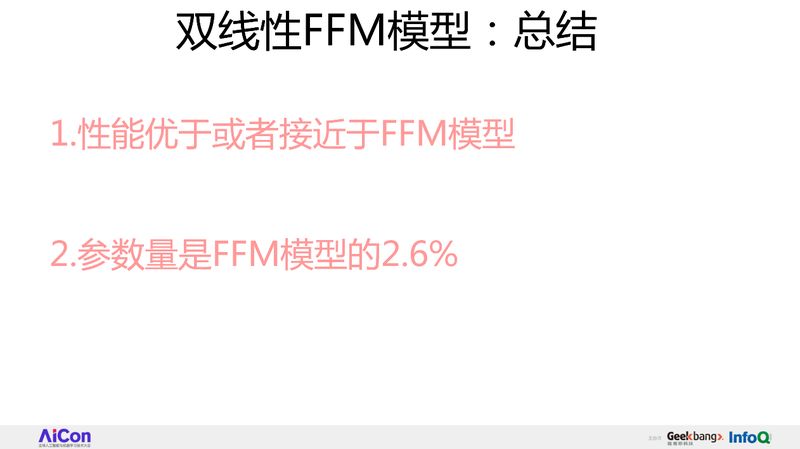 总结一下双线性 FFM 模型:它的性能接近于 FFM,但是参数量是 FFM 模型的 2.6%,这是它的优点所在。