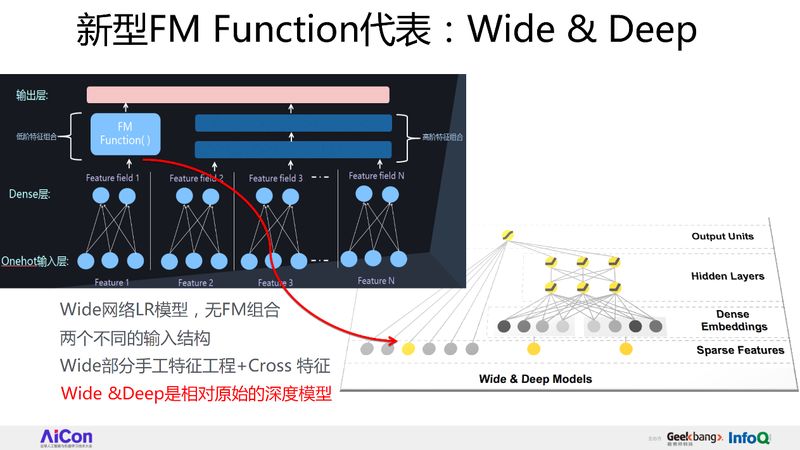 Wide&Deep 的结构是什么呢?实际上就是我画的并行结构,右边就是 DNN 部分,左边的 FM Function 用的是线性回归。我个人认为,Wide&Deep 是相对原始的模型,LR 有的问题它也有,特征组合需要人去设计,Wide&Deep 也有这样的问题。