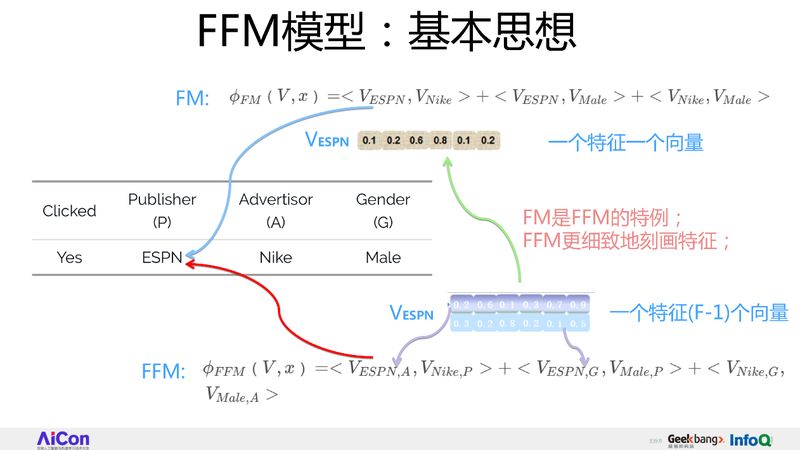 FFM 是 FM 的一个特例,它更细致地刻画了这个特征。首先它做了任意两个特征组合,但是区别在于,怎么刻划这个特征?FM 只有一个向量,但 FFM 现在有两个向量,也就意味着同一个特征,要和不同的 fields 进行组合的时候,会用不同的 embedding 去组合,它的参数量更多。对于一个特征来说,原先是一个 vector,现在会拓成 F 个 vector,F 是特征 fields 的个数,只要有跟它任意组合,就有一个 vector 来代表,这就是 FFM 的基本思想。