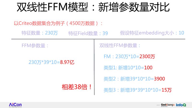 估算一下改进的模型它的参数量跟 FFM 比是什么情况?如果说我们用 Criteo 这个 4500 万的数据集,它有 230 万个特征,39 个 Fields,假设 embedding size 是 10,如果用 FFM 就会有 8.97 亿的参数量,而用双线性 FFM,FM 部分是大概 2300 万的参数,刚才三个改进模型中,类型一 100 个参数,类型二 3900 个参数,类型三 15 万参数,与 FFM 相比,参数差了 38 倍,但性能两者是相当的,这就是这个模型的价值所在。