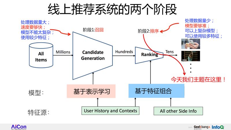 我刚才说了三个过程:召回、粗排、精排,但是最常见的还是两个阶段的,就这张图展示的。